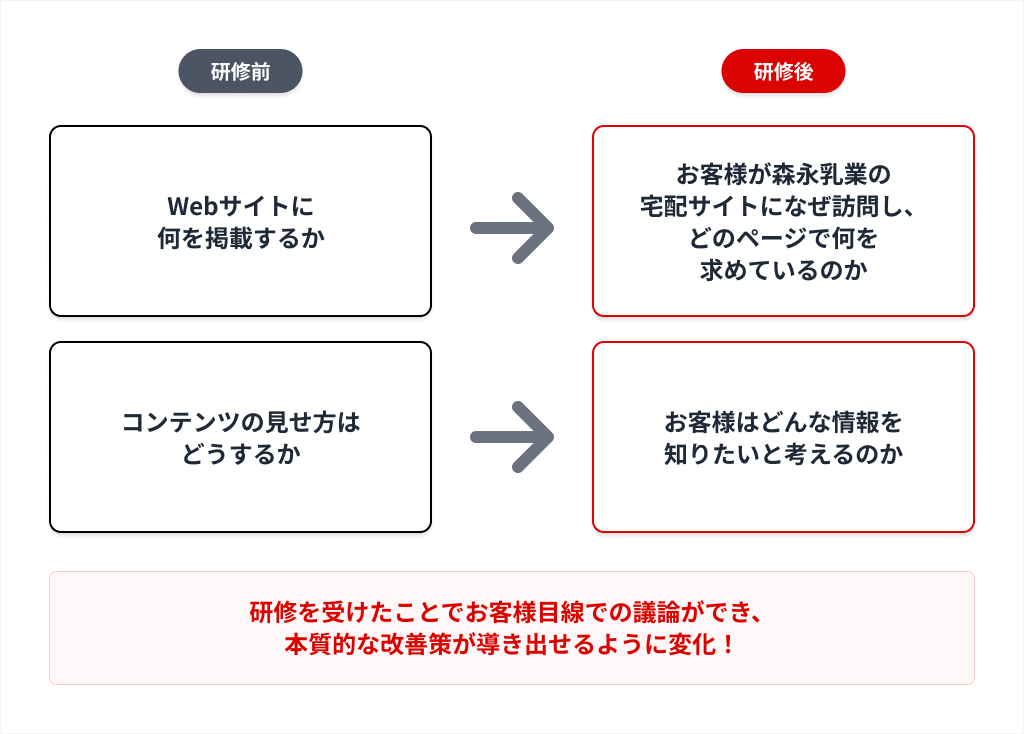 以前は、施策改善について議論する際、「Webサイトに何を掲載するか」「コンテンツの見せ方はどうするか」といった表面的な話が中心でした。しかし、研修を受講したことで、「お客様が森永乳業の宅配サイトになぜ訪問し、どのページで、何を求めているのか」「お客様はどんな情報を知りたいと考えるのか」といった、より深いニーズに意識を向けられるようになりました。つまり、カスタマージャーニーに基づいた施策設計ができるようになったんです。企業目線からお客様目線へと議論の質が変化したことで、より本質的な改善策が導き出せるようになりました。