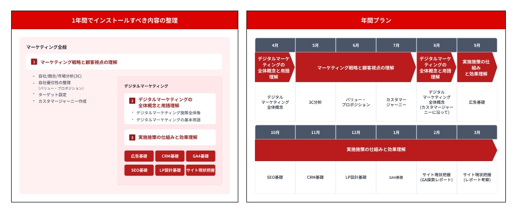 シナジーマーケティング 鈴木(以下、鈴木英) ご提案したDX BOOSTERの研修プログラムは、企業様のサービス内容や状況、課題に合わせて設計しています。今回の森永乳業様の研修では、「デジタル化推進プロジェクトをより促進するためのデジタルマーケティング知識、スキルの獲得」をゴールに設定し、前半はマーケティング領域全般に関する内容、後半はデジタルマーケティング領域に特化した内容の2部構成としました。いきなりSEOやWeb広告といったデジタル施策の知識やテクニックをインストールしたりせず、まずは施策の検討や分析をする際の思考のもととなる基礎から学んでいただく構成にしています。